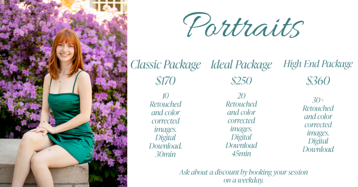 Choosing a photographer is a big decision, and with very good reason! I believe that photographs are some of the most precious keepsakes we have to take with us through the years. With each photographer comes a unique style, value, and vision. Each package is customizable to make sure it fits your needs, but listed here are the most popular packages to start from!
